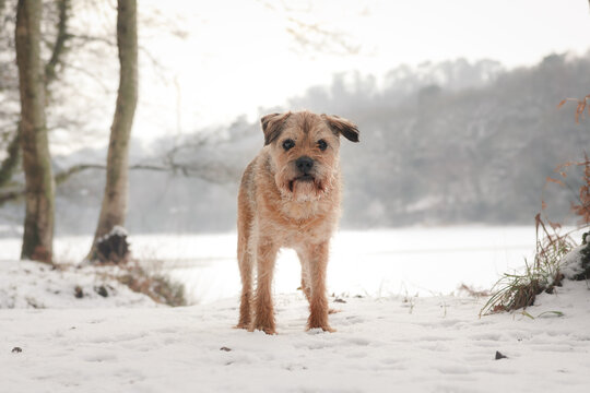 Border terrier dog in snowy Staffordshire