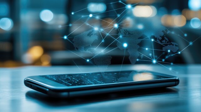 A smartphone in the foreground highlights a digital network overlaying a blurred world map, illustrating global connectivity and communication across borders