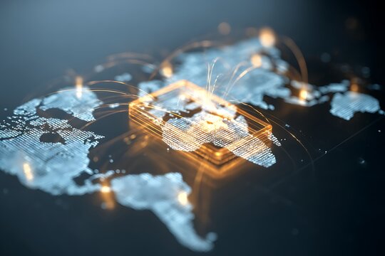 digital wallet icon connected to holographic world map by glowing lines, representing borderless payment system