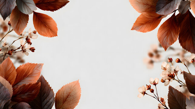 Delicate autumn leaves along top and bottom borders, plain white background, Fall border, text-ready center