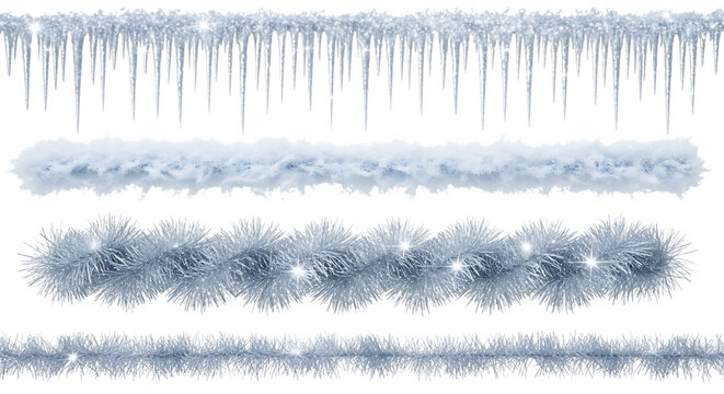 Set of various decorative cream frosting and royal icing borders for cake design isolated on white.