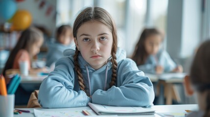 Frustrated and unhappy teen girl at school.
