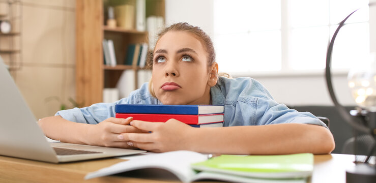 Tired female student preparing for exam at home