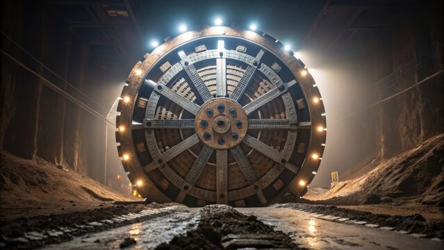 Medium closeup of a tunnel boring machines rotating ter head with thick steel blades and lights illuminating the muddy earth symbolizing the tingedge technology used in tunneling.