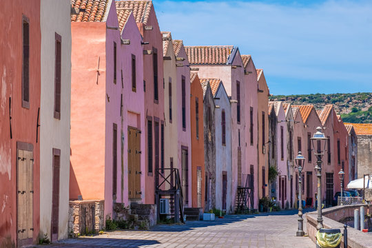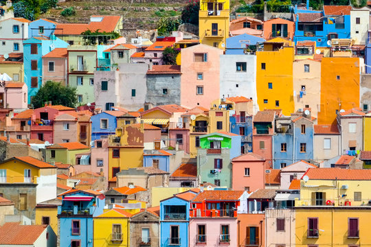 view of the facades of the houses of Bosa known for its characteristic colorful houses, Sardinia, Italy