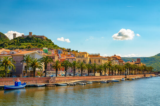 Bosa, Sardinia, Italy - Panoramic view of the old town quarter of Bosa by the Temo river embankment with colorful tenement houses and boats