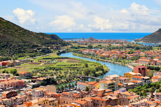 The village of Bosa, Sardinia. Panorama of the city of Bosa with the mouth of the river Temo on the Mediterranean, Italy.