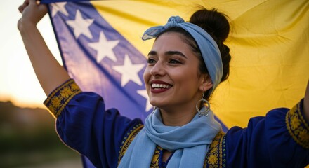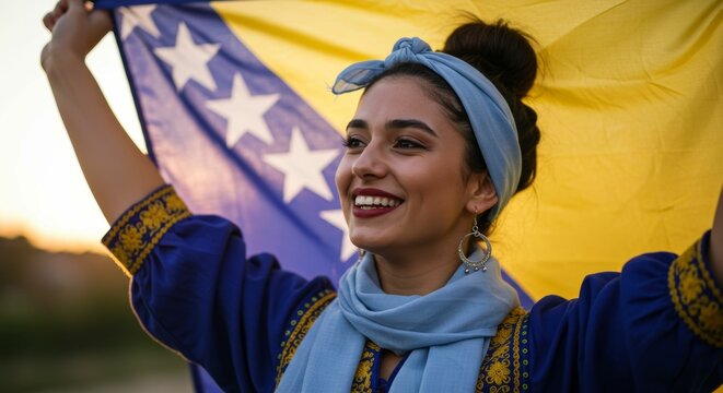 Proud Woman Holding the Flag of Bosnia and Herzegovina at Sunset