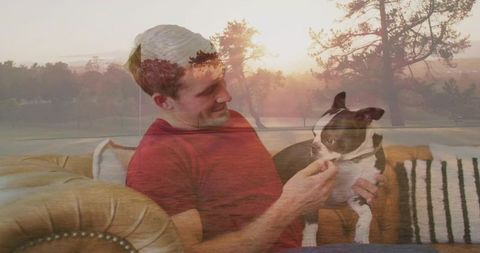 Man cuddling boston terrier on tufted leather sofa with sunset park double exposure