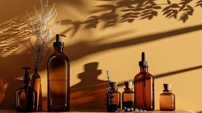 Amber glass bottles and jars, lit by sunlight, with botanical and shadow accents