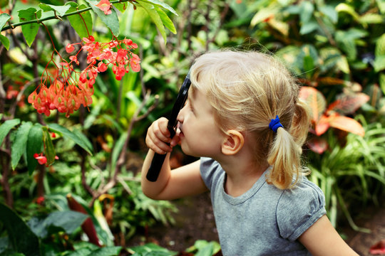 Portrait of cute adorable white Caucasian girl looking at plants flowers begonia through magnifying glass. Child with loupe studying learning nature. Early development education concept.