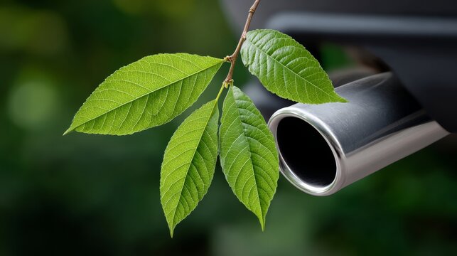 A leafy green branch is next to a car's exhaust pipe. The exhaust pipe is silver and has a black top. Concept of nature and the contrast between the natural world and man-made objects