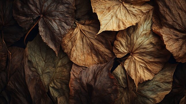 Macro close-up showing dried leaf litter and curled veins creating brown autumn texture