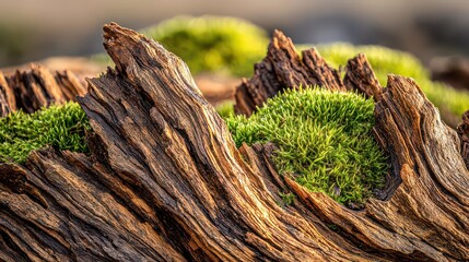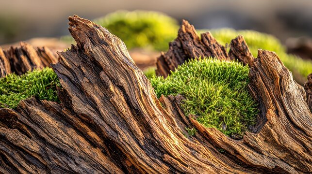 Close Up of Weathered Tree Stump Covered in Green Moss Patches