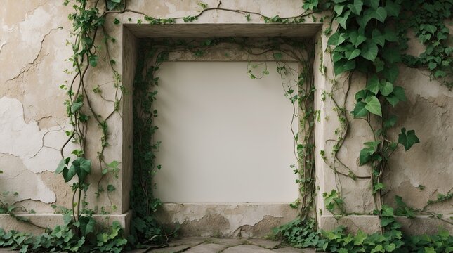 Old Weathered Wall with Ivy Vines and Empty Frame Space