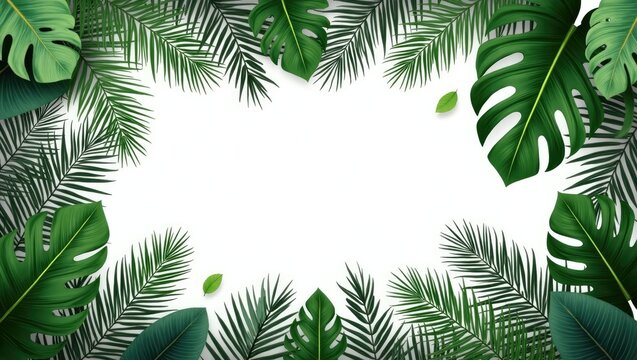 Lush green tropical leaves, including monstera and fern fronds, frame a central white space against a stark white background, creating a botanical border for design and adding a natural,