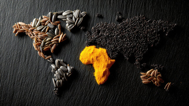 Creative world map assembled from diverse seeds spices, highlighting Africa. Detailed world map crafted from various seeds spices, showcasing Africa in vibrant turmeric powder on dark slate surface