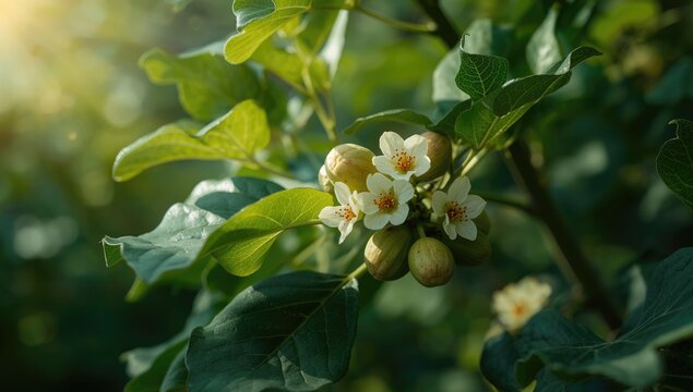 Detailed view of fig blooms on a tree in a botanical garden, highlighting flowering stage and summer foliage