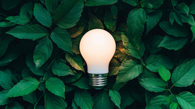 Illuminated lightbulb led among vibrant green leaves symbolizes environmental sustainability concepts beautifully.