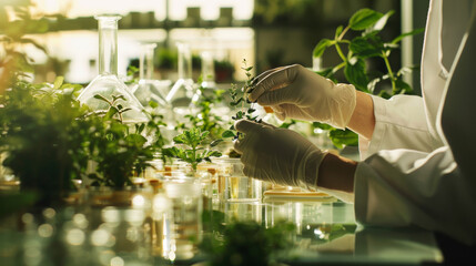 A scientist in a lab coat carefully conducts plant research in a high-tech laboratory, using advanced equipment and test tubes.