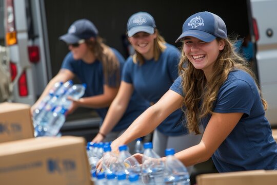 Volunteers Working Together, Packing Bottled Water for Donation, Teamwork and Community Service
