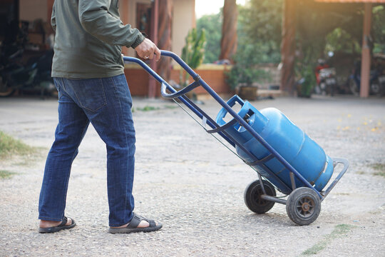 Close up man carries small cart that load blue gas cylinder tank  to make delivery to local customer in rural of Thailand. Concept Energy saving Gas for cooking in daily life. Gas tank use with stove
