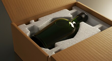 A single green glass bottle, possibly containing wine or spirits, is securely nestled in a custom-fit white polystyrene foam insert inside an open cardboard box.