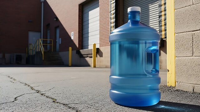 A large blue plastic water dispenser bottle sits on cracked pavement near a loading dock. 5 gallon water jug clean drinking water concept for marketing materials
