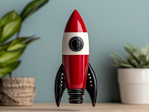 Red rocket launching against blue sky background