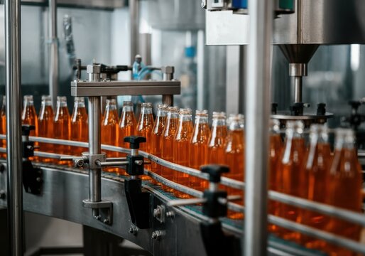 bottls of fruit juice on beverage factory conveyor belt for quality control