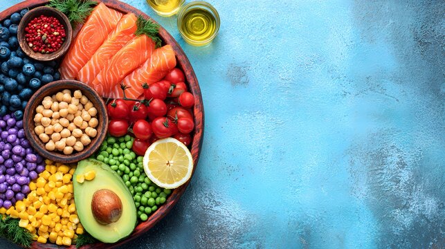 Colorful poke bowl with salmon and avocado placed at bottom edge over pastel blue background
