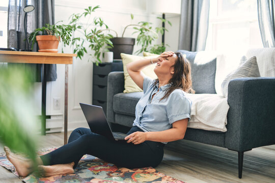 woman sitting surfing the internet on a laptop computer on a sofa at home