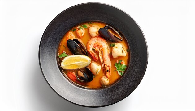 top view of a delicious looking bouillabaisse on a dark stoneware bowl isolated on a white white background
