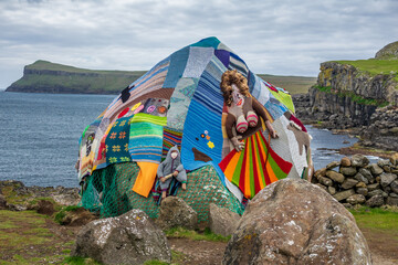 Eldgos and frumskogur, boulder covered with clothes in Sandoy