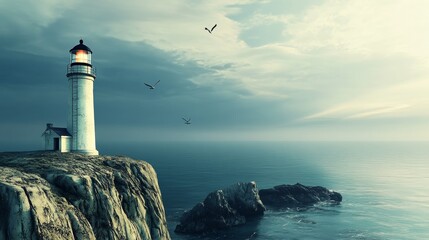 A solitary lighthouse glows under a dramatic, cloud-filled sky by the ocean, evoking feelings of solitude, resilience, and timelessness at dusk.