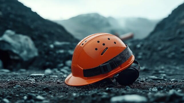 Orange safety helmet with goggles lying on rocky terrain at construction site or quarry, emphasizing safety and hard hat protection in industrial settings.