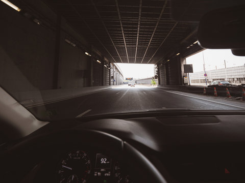 Driver POV personal perspective including the steering wheel and the front driving cars exiting the tunnel of Boulevard peripherique in Paris, France - vintage warm filter