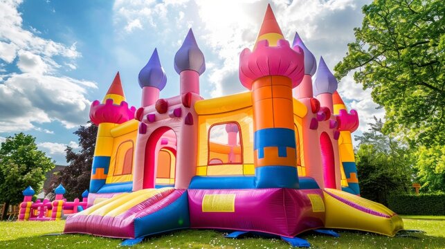 beautiful colorful inflatable castle in a garden patio during the day