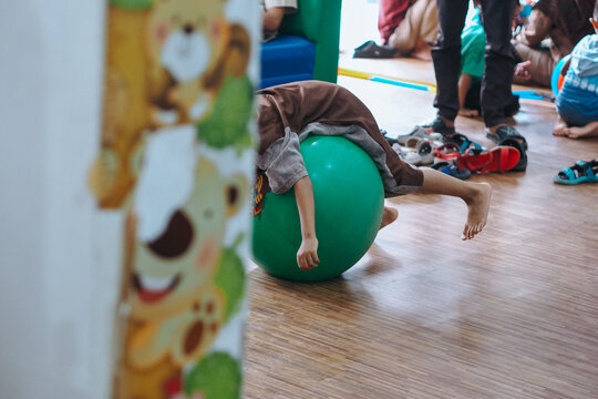 Happy little girl having lots of fun while jumping from ball to ball on an inflate castle.