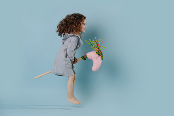 little sports girl jumps on a trampoline. Outdoor shot of girl jumping on trampoline, enjoys jumping in home. happy summer vacation