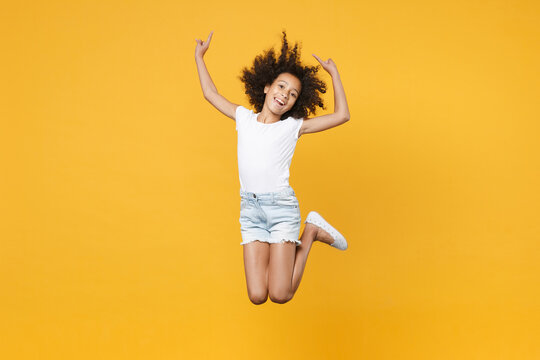 Full length portrait of funny little african american kid girl 12-13 years old in white t-shirt isolated on yellow wall background. Childhood lifestyle concept. Jumping, pointing index fingers up.