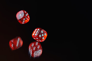 Two red dice in motion on a black background. Soft tinted image. Gambling in the casino.