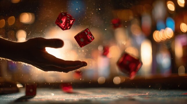Close up of hand throwing red dice with bokeh background during game night or casino.