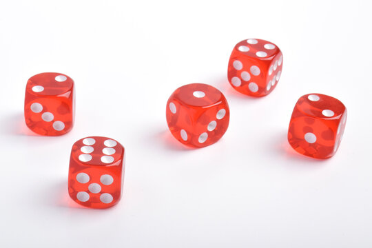 Multiple glossy red dice with white dots floating in the air, realistic graphic style on a light background, concept of chance and gaming. Ai generative