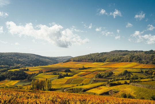 Paysage de vignes en automne. Bourgogne en automne. Côte d'Or pendant l'automne. Vignes dorées. Période des vendanges. Viticulture et agriculture en Bourgogne, France. Saint Romain 21190