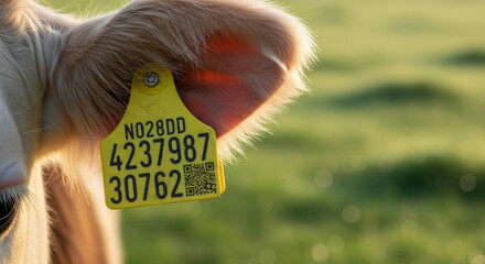 Brinco de identificação em orelha de bovino com numeração em pastagem verde