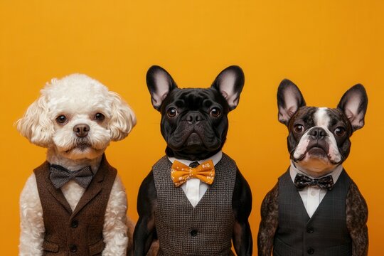 Dapper Dogs: Three canines dressed in stylish vests and bow ties strike a fashionable pose against a bright yellow background.