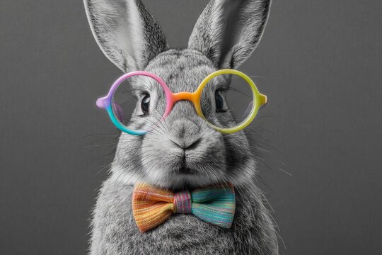 Cute Rabbit With Colorful Glasses and Bow Tie in Monochrome Setting, 8K Resolution Close-Up Capture