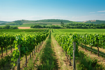 Stylish cat in a suit and sunglasses stands in a vineyard with grapes