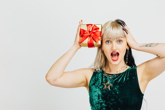 Portrait of a young blonde woman with mouth open holding golden gift with red bow